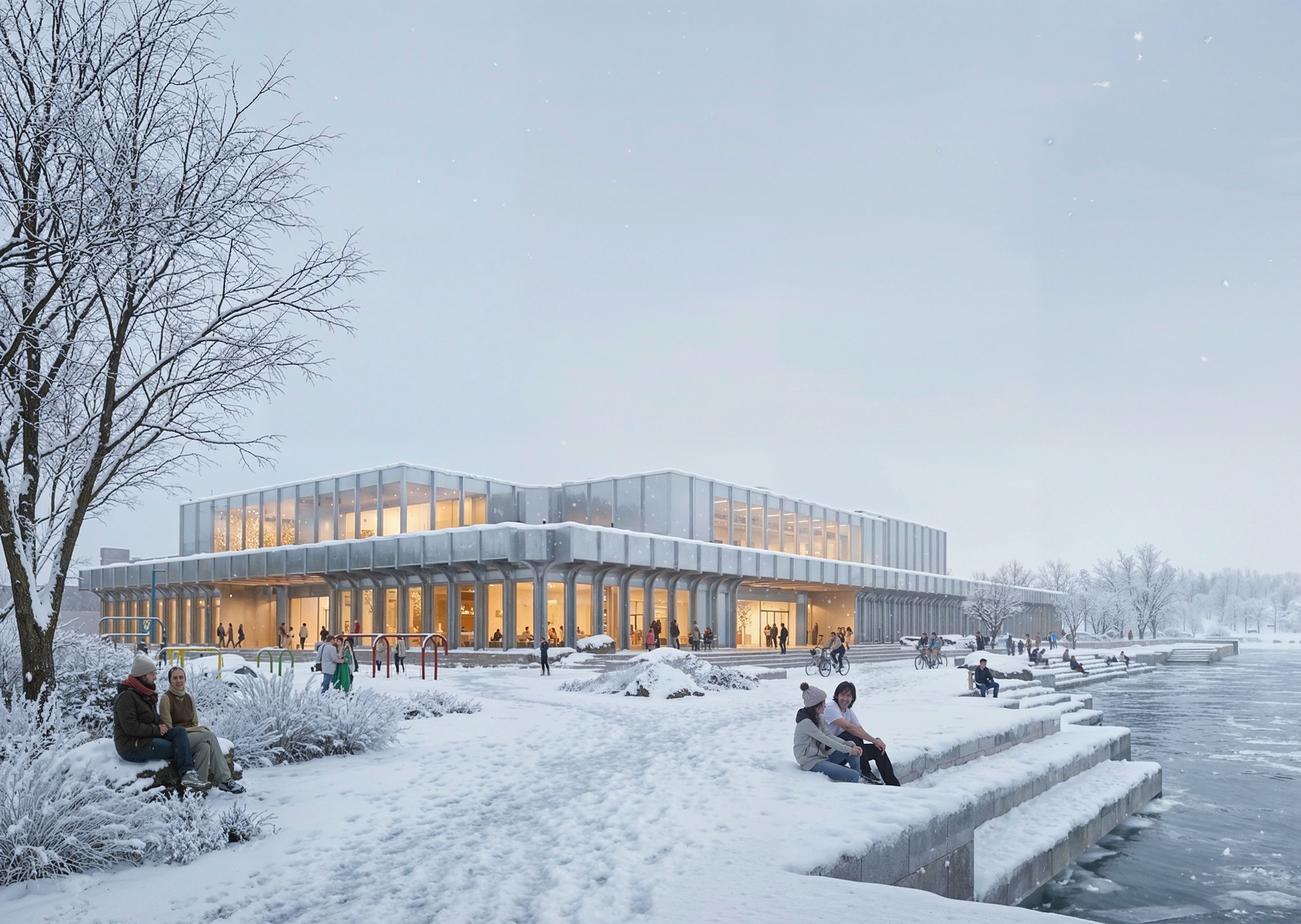 The building's shimmering materiality embodies a historical understanding of time as it relates to the environment, the changing seasons, and the sun's annual cycles. It serves as a marker of environmental time, adapting and reflecting the significant variations in sunlight throughout the day and year. The building's structure is an exploration of material time, featuring a contrasting palette of construction methods and materials that span ancient to futuristic. Stone represents slow, ancient time; timber symbolises steady, organic time; and aluminium evokes manufactured, cyclical time.
